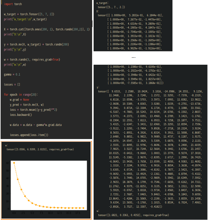 파이토치의 기본 텐서를 이용하여 다음의 매개변수를 가지는 선형회귀모델을